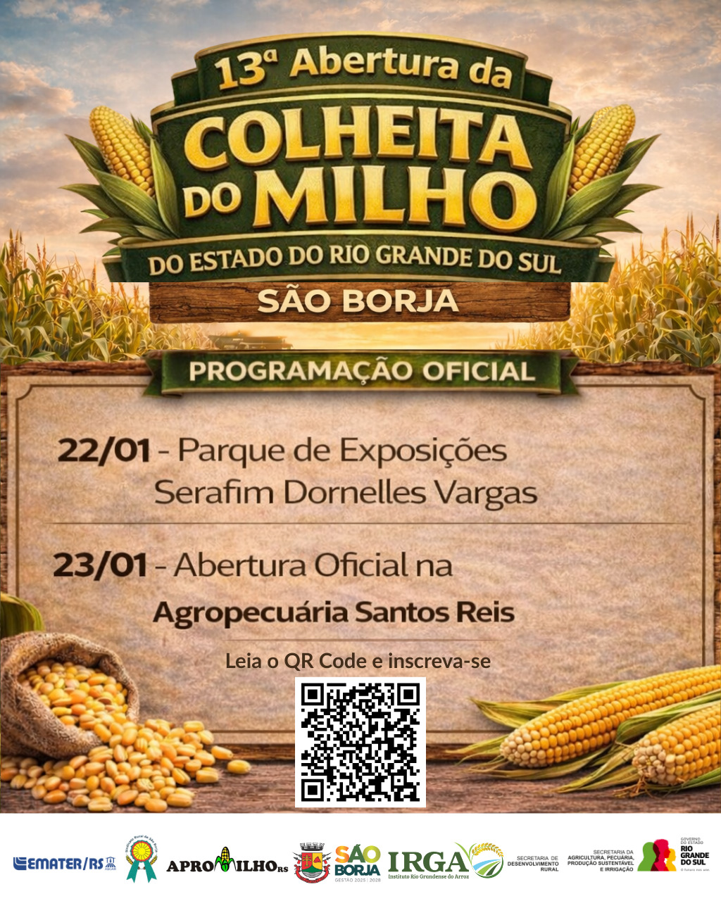 Na sexta-feira (23/01), a partir das 7h30, na Agropecuária Santos Reis, haverá recepção, credenciamento e visita a área demonstrativa com ensaio de 24 híbridos de milho de oito empresas, bioinsumos, manejo de adubação e sistemas de irrigação, conduzidos pela Emater/RS-Ascar. O evento é uma realização da Prefeitura de São Borja, com o apoio de entidades, instituições técnicas e empresas do setor agrícola. O ponto alto da programação ocorre às 11h, com o ato oficial de Abertura da Colheita do Milho no Rio Grande do Sul, que contará com a presença do secretário da Agricultura, Pecuária, Produção Sustentável e Irrigação, Edivilson Brum, além de autoridades estaduais, regionais e municipais.
