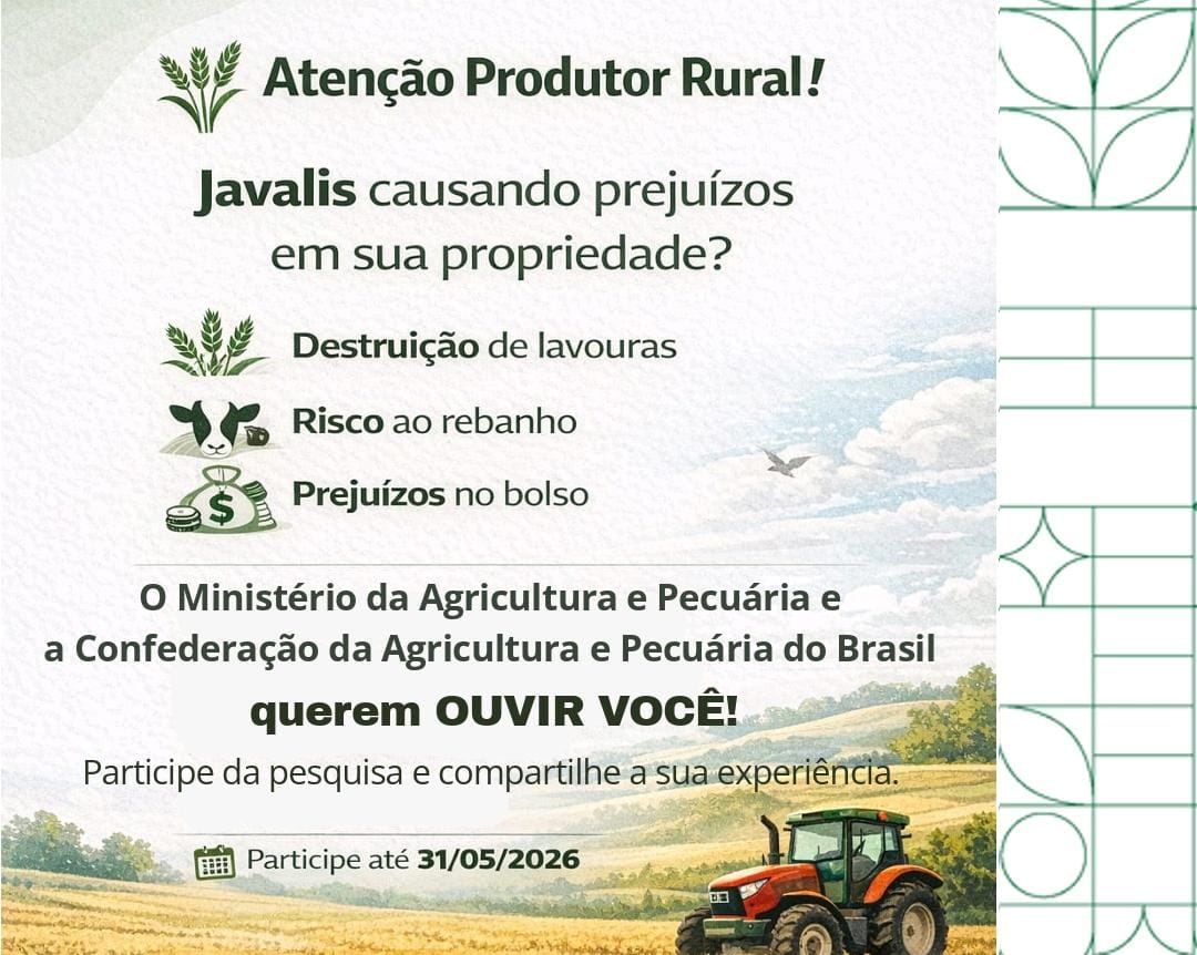 O Programa Nacional de Sanidade Suídea (PNSS) está distribuindo um conjunto de perguntas destinado aos agentes de manejo populacional de javalis. O “Questionário Suínos Asselvajados – Percepção de Presença e seus Impactos no Brasil (2025)” não tem caráter obrigatório ou fiscalizatório e visa compreender os impactos da presença de javalis e seus híbridos nas propriedades rurais brasileiras. As informações coletadas serão utilizadas exclusivamente para embasar políticas públicas voltadas à proteção da produção agropecuária.